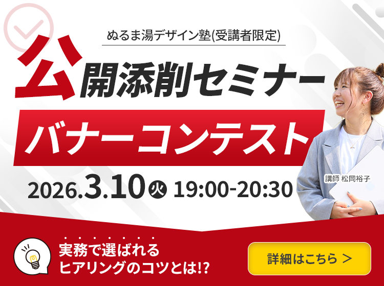 こんにちは!エキスパート講師の松岡です^^ 3月の公開添削はバナーコンテスト!今回は・・・インスタライブ告知バナーの制作 そして、提案次第では私の運営するぬるま湯公式インスタグラム運営のお手伝いを継続的にお願いしたいと思 […]
