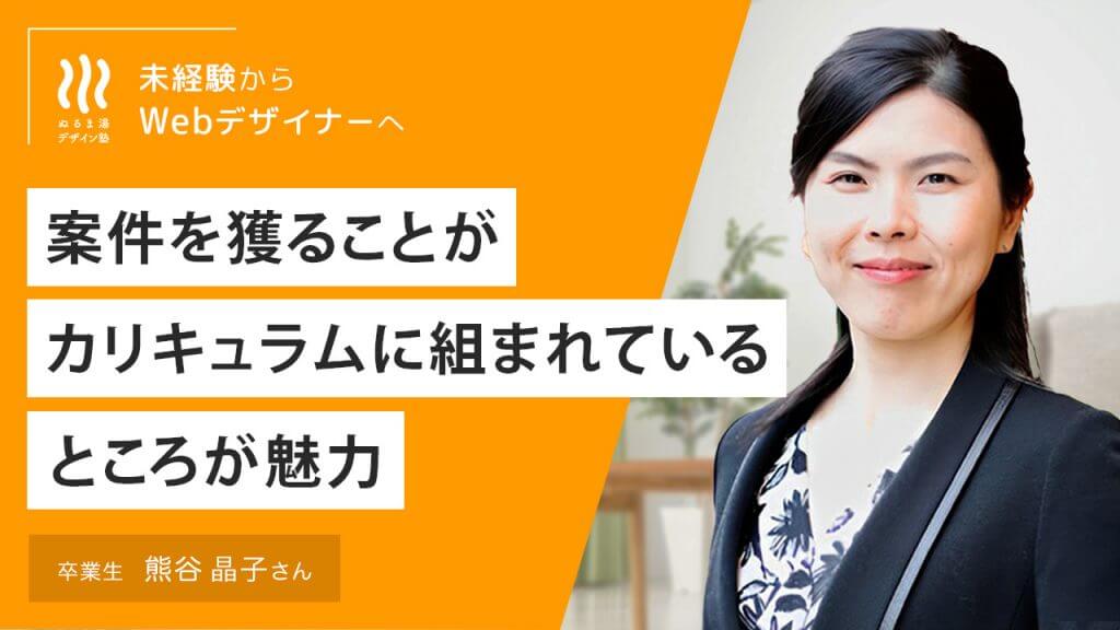 自己紹介をお願いします。 熊谷晶子です。Eコマースの会社で営業をしています。 入塾時のWEBデザイン経験やPCスキルについてのレベルは? PCスキルは仕事でエクセル パワーポイントを日常的に使うレベルです。 ぬるま湯の前