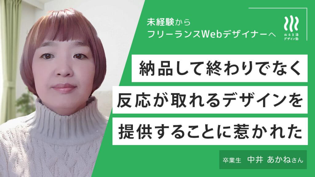 ぬるま湯塾を受講したきっかけは? YouTube広告でたまたま見かけました。そのときは、デザイナーになろうという感じではなかったのですが、デザインに興味がありました。前職でwebメディアの運営をしていてサムネイルとかを独