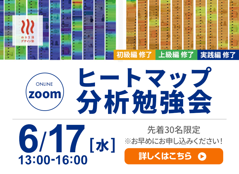 ~ユーザー行動を“見える化”し、成果につながるデザインへ~ 日程 2026年6月17日(水) 時間 13:00〜16:00 参加講師 未定 場所 zoom(オンライン開催) 学習内容 ヒートマップを活用した分析手法を学び