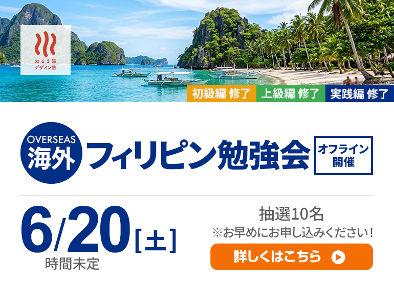 日程 2026年6月20日(土) 時間 未定 場所 フィリピン 学習内容 未定 定員 抽選10名 対象 未定 持ち物 参加費 その他 詳細は追ってご案内いたします ※ ~3/22(日)まで仮申し込み受付中です。