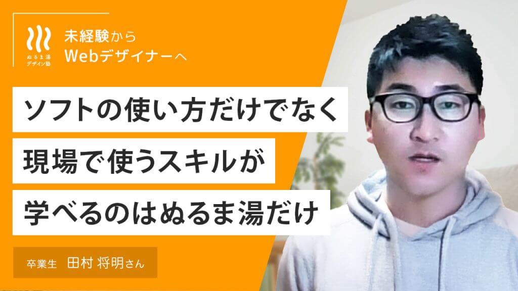 自己紹介をお願いします。 田村まさあきと申します。前職は公務員で、現在はプロのwebデザイナーになるために勉強中です。 セミナーを受ける前の悩みは? ぬるま湯デザイン塾を受講する前に、別のスクールに通っていたんですけれど