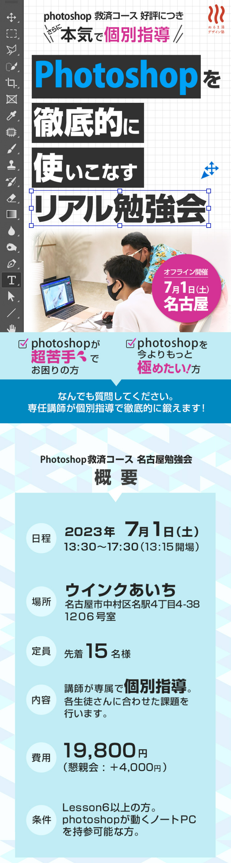 【募集開始】7月1日(土)名古屋リアルPs救済コース開催! 2023年6月13日 / photoshop救済コース, 名古屋勉強会 ▼Ps救済コース+懇親会▼http://live-publishing.jp/click/nagoya/ ▼Ps救済コースのみ参加の方はこちら▼ http://live-publishing.jp/click/nagoya2/ 参加希望者はこちら! ▼Ps救済コース+懇親会▼http://live-publishing.jp/click/nagoya/ ▼Ps救済コースのみ参加の方はこちら▼ http://live-publishing.jp/click/nagoya2/