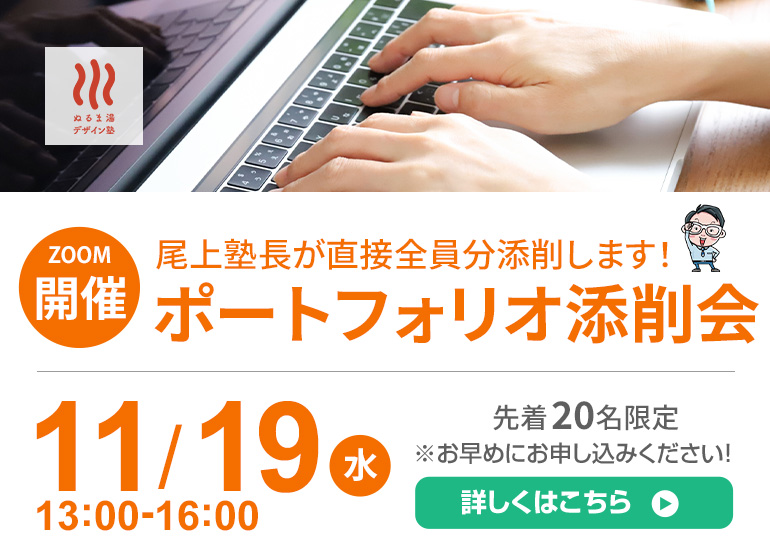 | 対象 | ぬるま湯受講生&卒業生 ※提出できるポートフォリオサイトを制作済みの方に限ります。 |