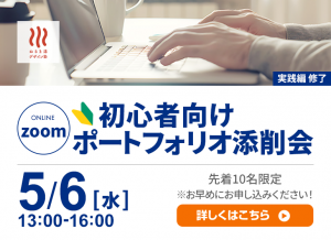 ~ユーザー行動を“見える化”し、成果につながるデザインへ~ 日程 2026年5月6日(水) 時間 13:00〜16:00 参加講師 伊藤 場所 zoom(オンライン開催) 学習内容 卒業したがどうやってポートフォリオをブ … 続きを読む これから活動する人向け!ポートフォリオ添削会