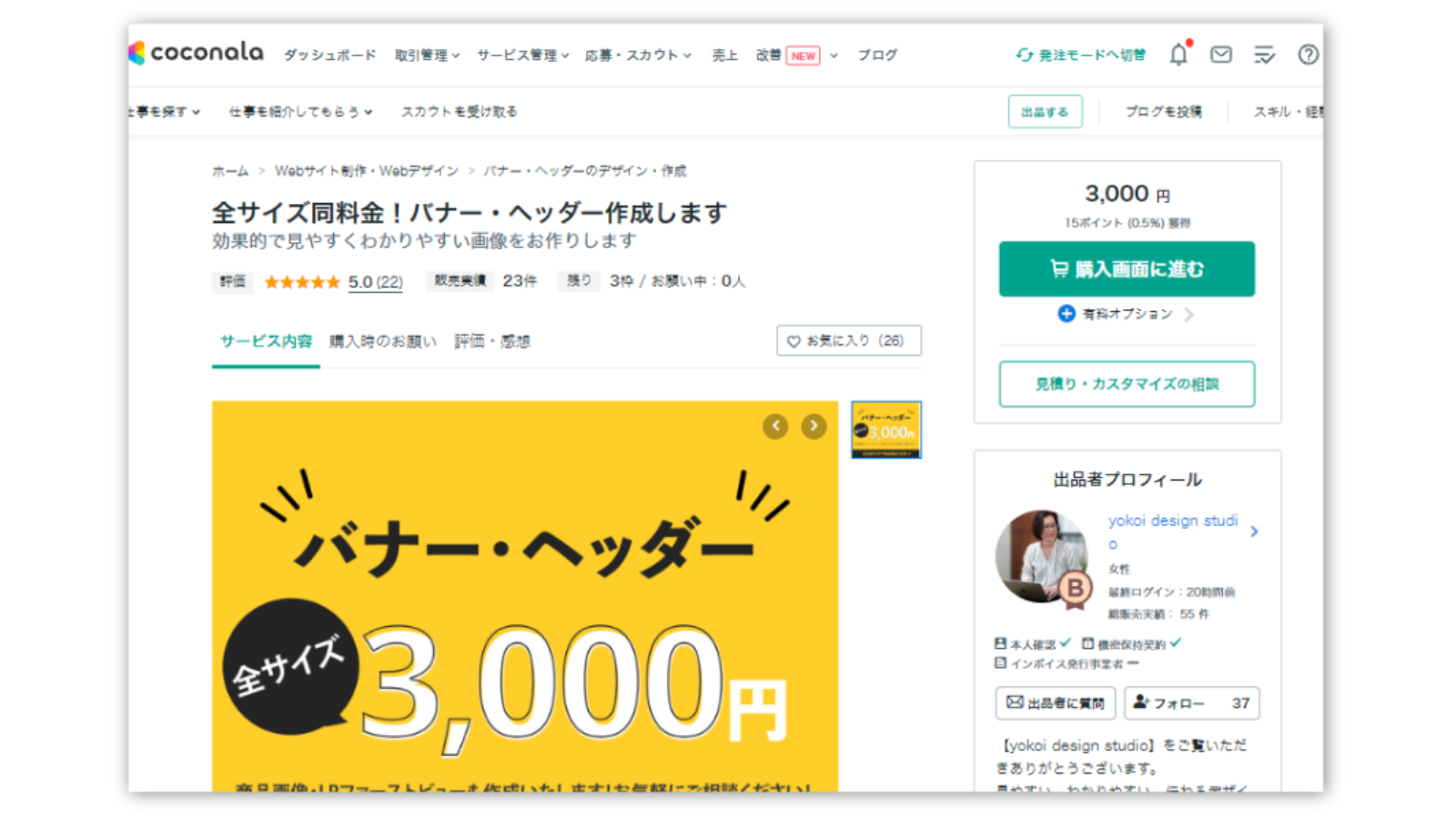 ただ、売れてないときでも小さな成長の兆しはありました。なぜかココナラのバナー・ヘッダーデザインカテゴリで私の出品が1ページ目に出てくるようになったのを見かけて、偶然かもしれないけど嬉しくなって。努力が少しずつ見える形になってきた気がしたので、細々とココナラのプロフィールや出品を改善し続けました。