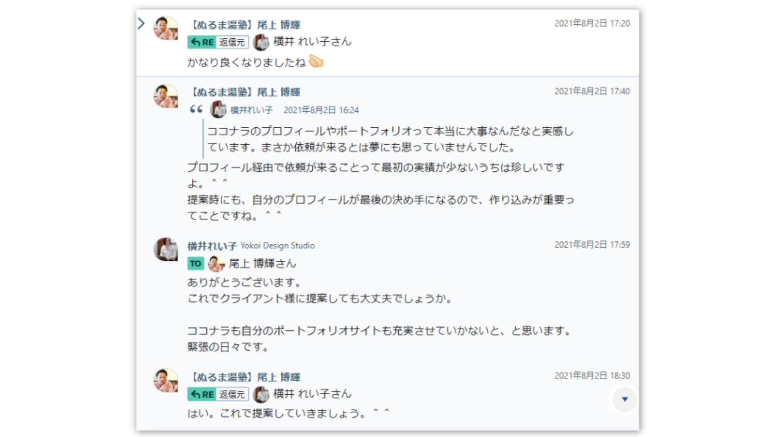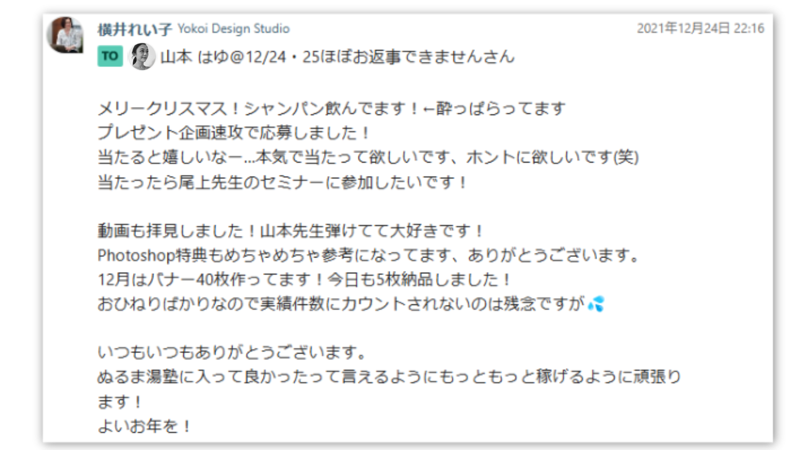 事務局を始めて、”後輩デザイナーの入塾時の熱意や行動力に感化されてやる気スイッチが入ったから”というのがあります。信じられないかもしれませんが、ぬるま湯塾生の方って入塾時に平均2000文字とか、ときには1万文字以上の熱い想いや目標を送ってくれます。