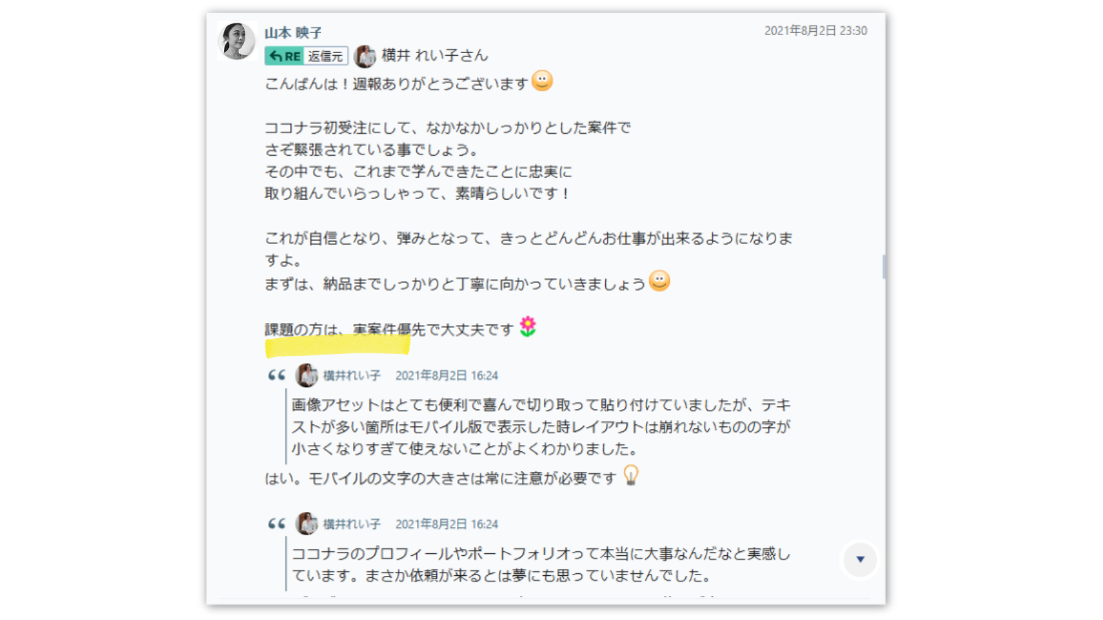こういう小さいことでも講師の方に報告してたから90日以降も変わらず相談しやすい関係性が築けていました。