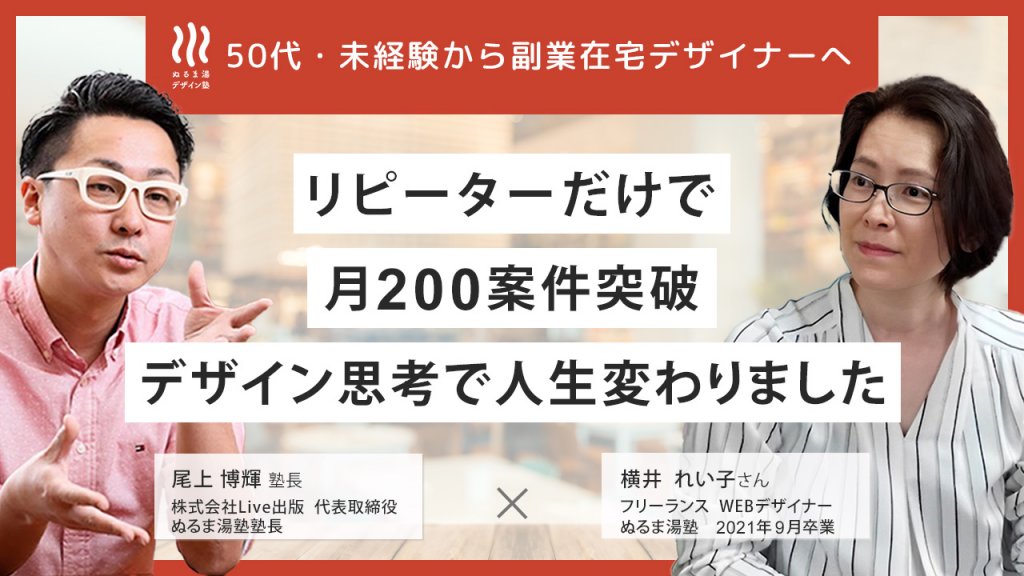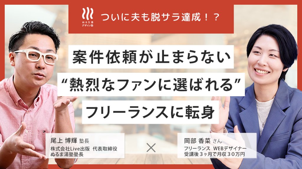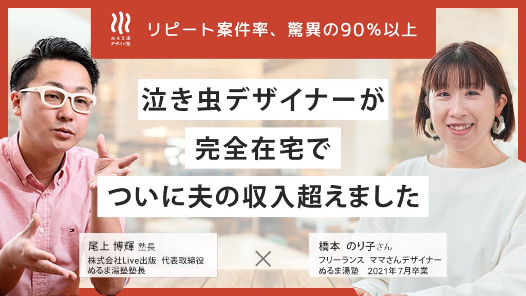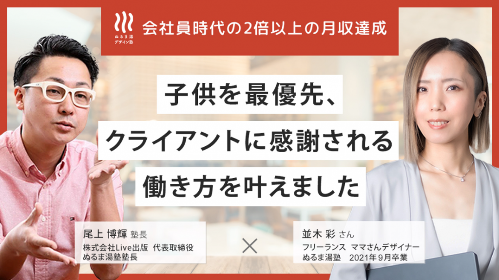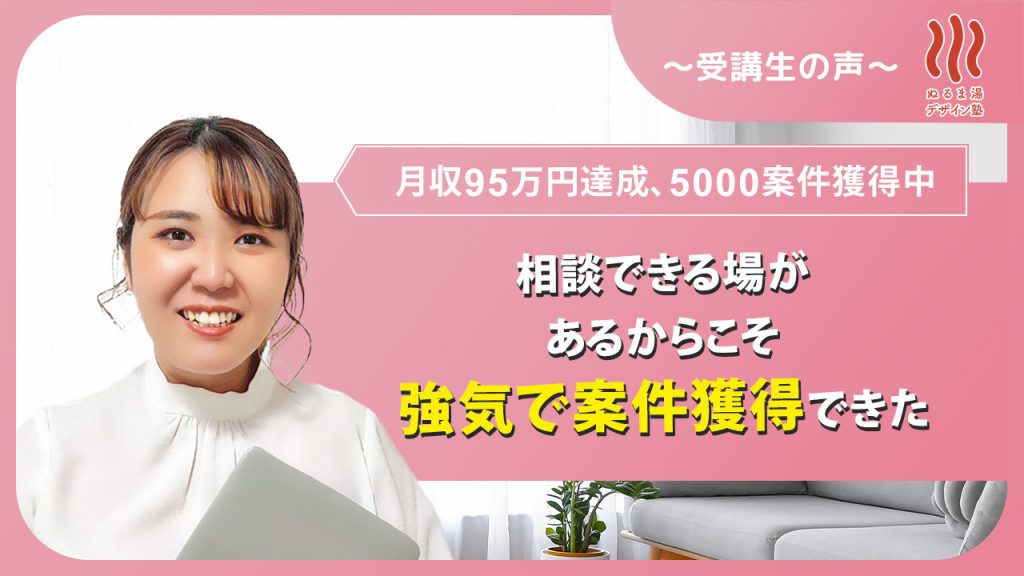 申込に繋がるデザインが作れるからこそ、お客様からも感謝され、事業の役に立つことで、信頼関係を構築し、リピートしてもらえるようになりました。 仕事時間も柔軟になったので、子どもが寝ている時間をメインに自分の好きな時間に稼働しています。 収入も会社員時代の約4.5倍と自分が1番驚いています。 毎月決まった給料で額面に不満に思うのではなく、頑張ればがんばった分収入に繋がるので収入面もやりがいにつながります。ココだけの話、大口クライアントからすでに5000件のWEBサイトの相談依頼をいただいています。
